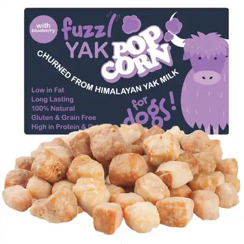 - ▶ Dietary: Healthy - High In Protein and Calcium, Low in Fat. Grain & Gluten Free Vegetarian Natural Treat, Fuzzl Yak Popcorn is ideal for dog enrichment and an excellent complimentary dog food - The perfect dog treats for small dogs, dog treats for medium dogs or dog treats for large dogs; Introducing Fuzzl Yak Popcorn with added blueberry, an excellent snack or training treat for dogs that they will love. Made with All Natural Himalyan Yak and Cow Milk with a hint of lime juice and blueberry, these tasty rawhide free dog chews make the perfect dog snack. The perfect grain free dog treats and healthy alternative to dog dental sticks or dog dental chews. These treats are also a great stocking filler, Easter or Christmas dog treats or gift. Fuzzl, Yak Popcorn, for pets that crave dog treats; Low Fat Dog Treats - Made with Premium Himalyan Yak and Cow Milk and All Natural, these dogs treats are Low in Fat. They make great large, medium and small dog treats and also delicious puppy training treats (+12 weeks). Long Lasting, Low Fat and Natural Dog Chews